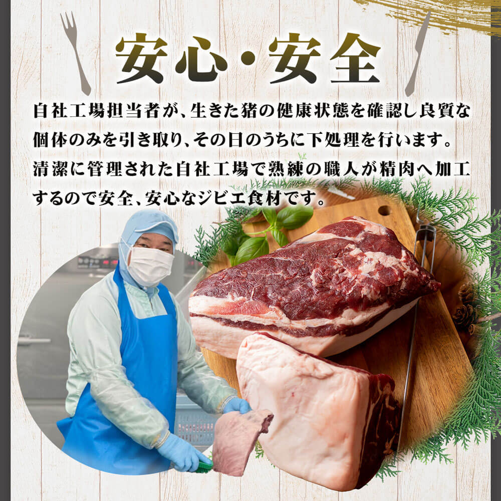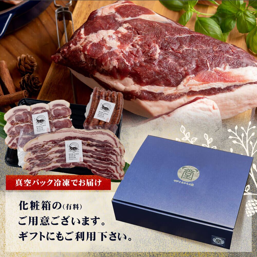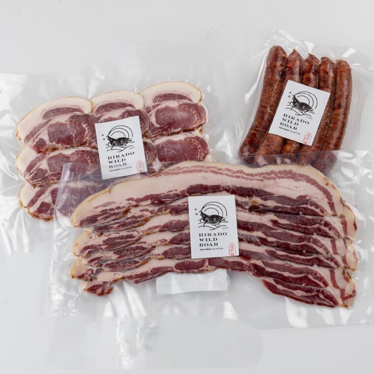 いのししの脂のおいしさと、肉の歯ごたえを活かした商品。しっかり燻製することで旨味と香りを引き出しています。いつものベーコンエッグが、一気にごちそうになるベーコン。濃厚で深い味わいを、お楽しみください。