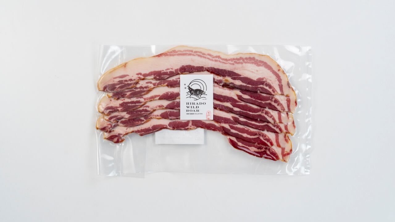 いのししの脂のおいしさと、肉の歯ごたえを活かした商品。しっかり燻製することで旨味と香りを引き出しています。いつものベーコンエッグが、一気にごちそうになるベーコン。濃厚で深い味わいを、お楽しみください。
